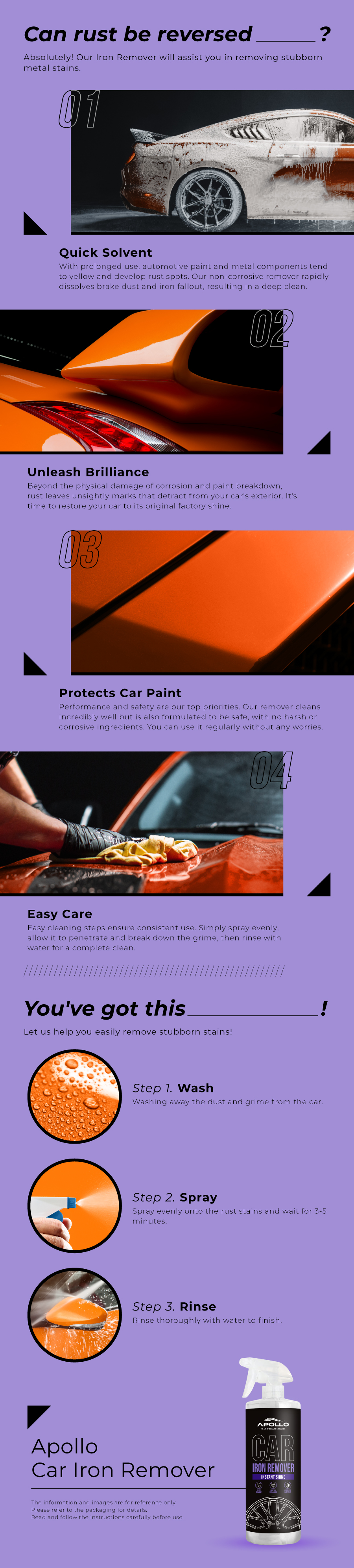 Rust ruins your car's look and safety. Removing it has always been a challenge, but not anymore! Worry no more! Apollo Car Iron Remover eliminates rust and other iron contaminants, stopping further damage in its tracks.