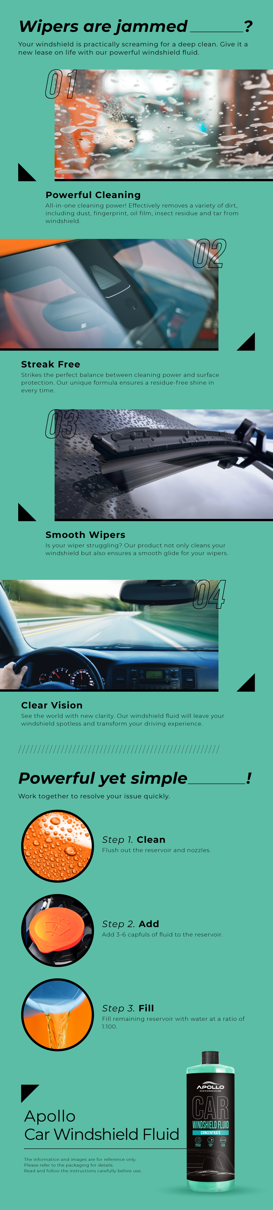 Besides dust, windshield can get dirty with insects, oil film and tar, which can affect the performance of your wipers. Apollo Car Windshield Fluid is specially designed to restore the clarity of your windshield.